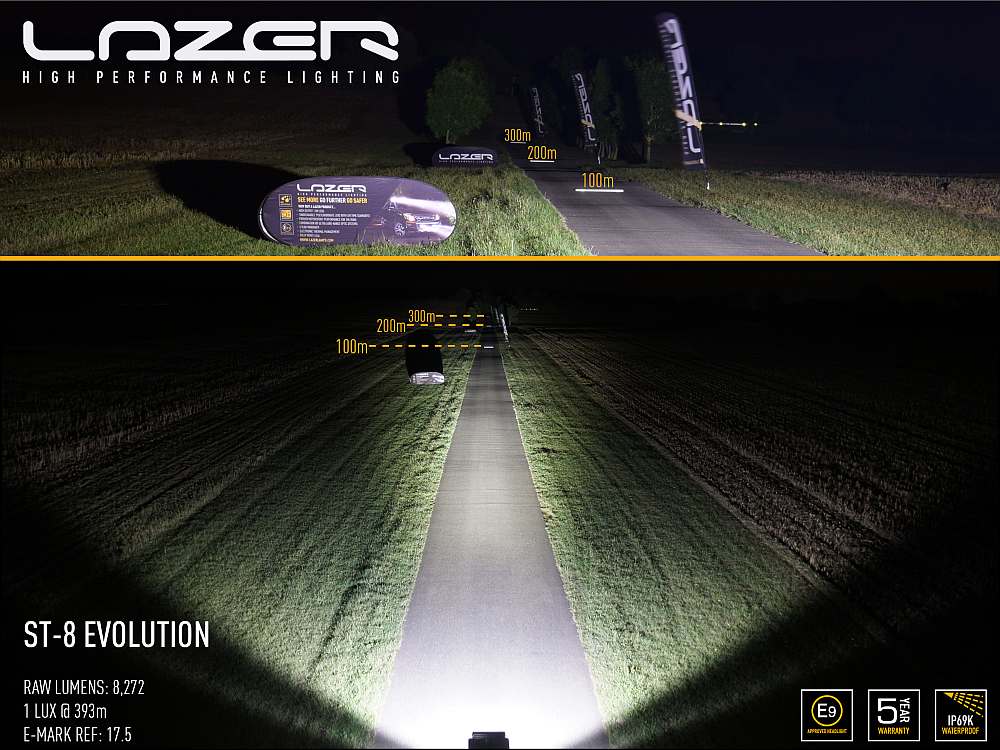 Mit einem Lichtstrom von 8.272 Lumen ist der Lazer Lamps ST8 Evolution-Scheinwerfer so leistungsstark wie zweieinhalb Xenon-Fernscheinwerfer bzw. so stark wie acht H4-Halogen-Fernscheinwerfer. Die hybride Lichtverteilung sorgt für ausgezeichnete Reichweite und breite Ausleuchtung im nahen und mittleren Entfernungsbereich und bietet dem Fahrer somit hervorragende Sichtbedingungen. Die Reichweite beträgt ca. 786 Meter.
