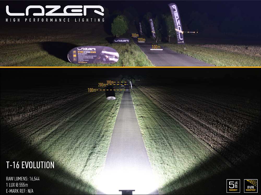 Mit einem imposanten Lichtstrom von 16.544 Lumen ist der Lazer Lamps T-16 Evolution-Scheinwerfer leistungsstärker als fünf Xenon-Fernscheinwerfer oder mehr als 16 H4-Halogen-Fernscheinwerfer. Die hybride Lichtverteilung sorgt für ausgezeichnete Reichweite und breite Ausleuchtung über alle Entfernungsbereiche und bietet dem Fahrer somit außergewöhnliche Sichtbedingungen. Die Reichweite beträgt ca. 1.111 Meter.