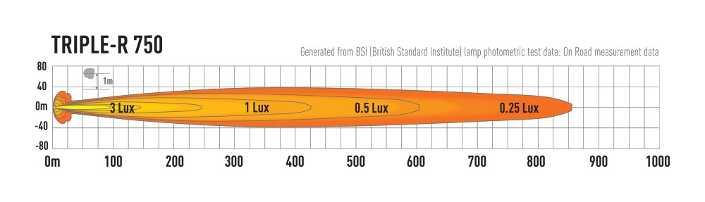Mit einem Lichtstrom von 4.100 Lumen ist der Triple-R 750-Scheinwerfer leistungsstärker als ein Xenon-Fernscheinwerfer oder wie ca. vier H4-Halogen-Fernscheinwerfer. Die Spot-Lichtverteilung sorgt für eine ausgezeichnete Reichweite von ca. 865 Meter. Mit einer ECE-Zulassung als Fernscheinwerfer darf der Triple-R 750 legal und eintragungsfrei am Fahrzeug verbaut werden. Die Referenzzahl ist 27,5.