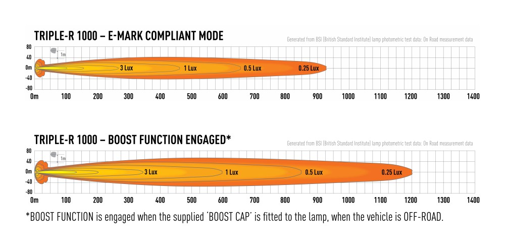 Der Triple-R 1000 ist mit der einzigartigen E-Boost-Technologie ausgestattet. Mit einer ECE-Zulassung als Fernscheinwerfer darf er legal und eintragungsfrei am Fahrzeug verbaut werden. Ohne die sogenannten Boost Cap reduziert sich der Lichtstrom auf gesetzeskonforme 4.920 Lumen und die Reichweite auf noch immer ausgezeichnete ca. 920 Meter. Die Referenzzahl ist 50.