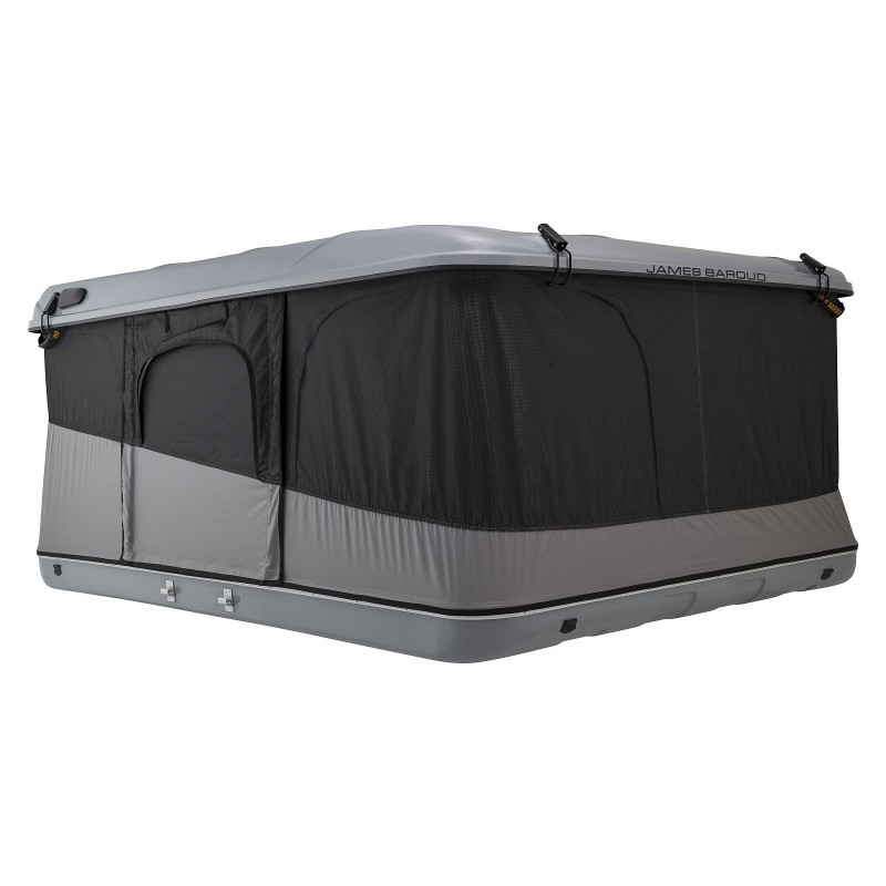 Alle Hartschalen-Dachzelte von James Baroud sind vollausgestattet und haben auf drei Seiten großzügige zweilagige Eingangstüren mit Fliegenschutzgittern. Die von beiden Seiten zu öffnende Reißverschlüsse ermöglichen ein flexibles Öffnen der Eingänge. Die geöffneten, aufgerollten Türen können mittels Klettband fixiert werden. Für eine angenehme Durchlüftung können die Türen z.B. nur oben etwas geöffnet werden.