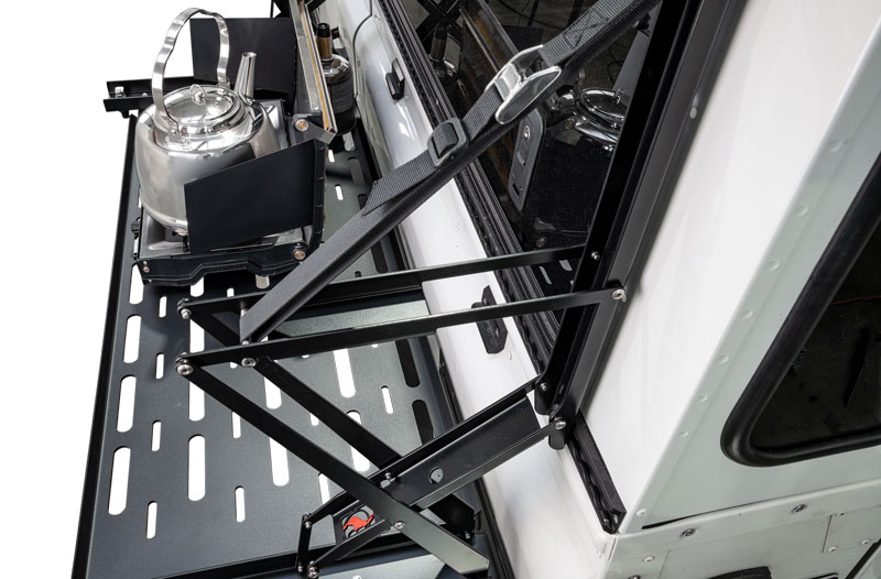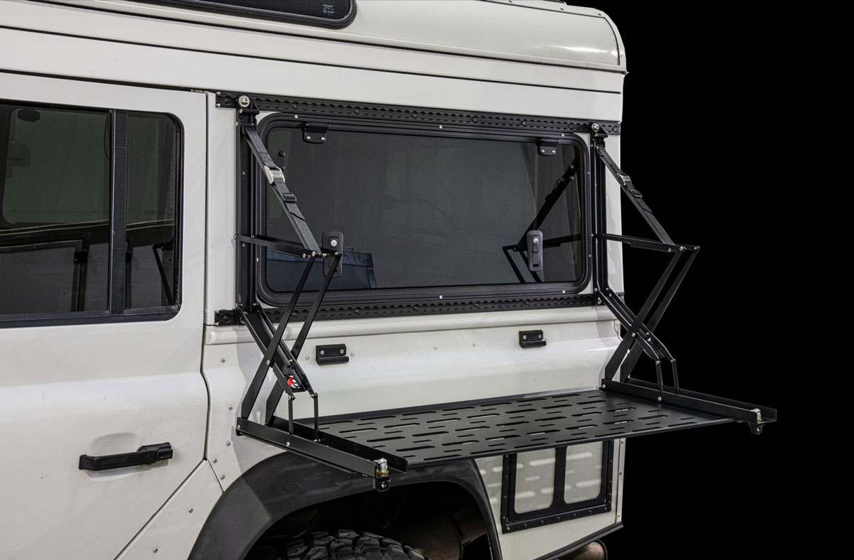 Wird er in Fensterhöhe montiert, wie beim Defender, Schützt er das Fenster komplett vor äusserer Einwirkung und kann abgesenkt als Aussentisch verwendet werden Unterstützt wird diese Funktion durch die optionale Tischplatte die gleichzeitig mit den Sandblechen montiert werden kann.