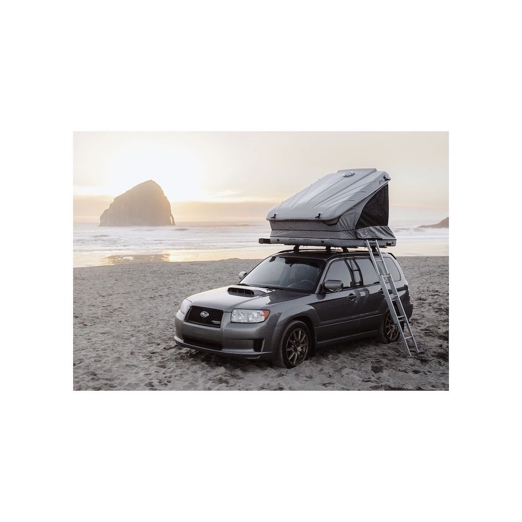 Die Öffnung erfolgt durch vier Gasdruckfedern nach dem Lösen von je zwei Verschlüssen an der Zeltvorderseite und an den hinteren Seiten.