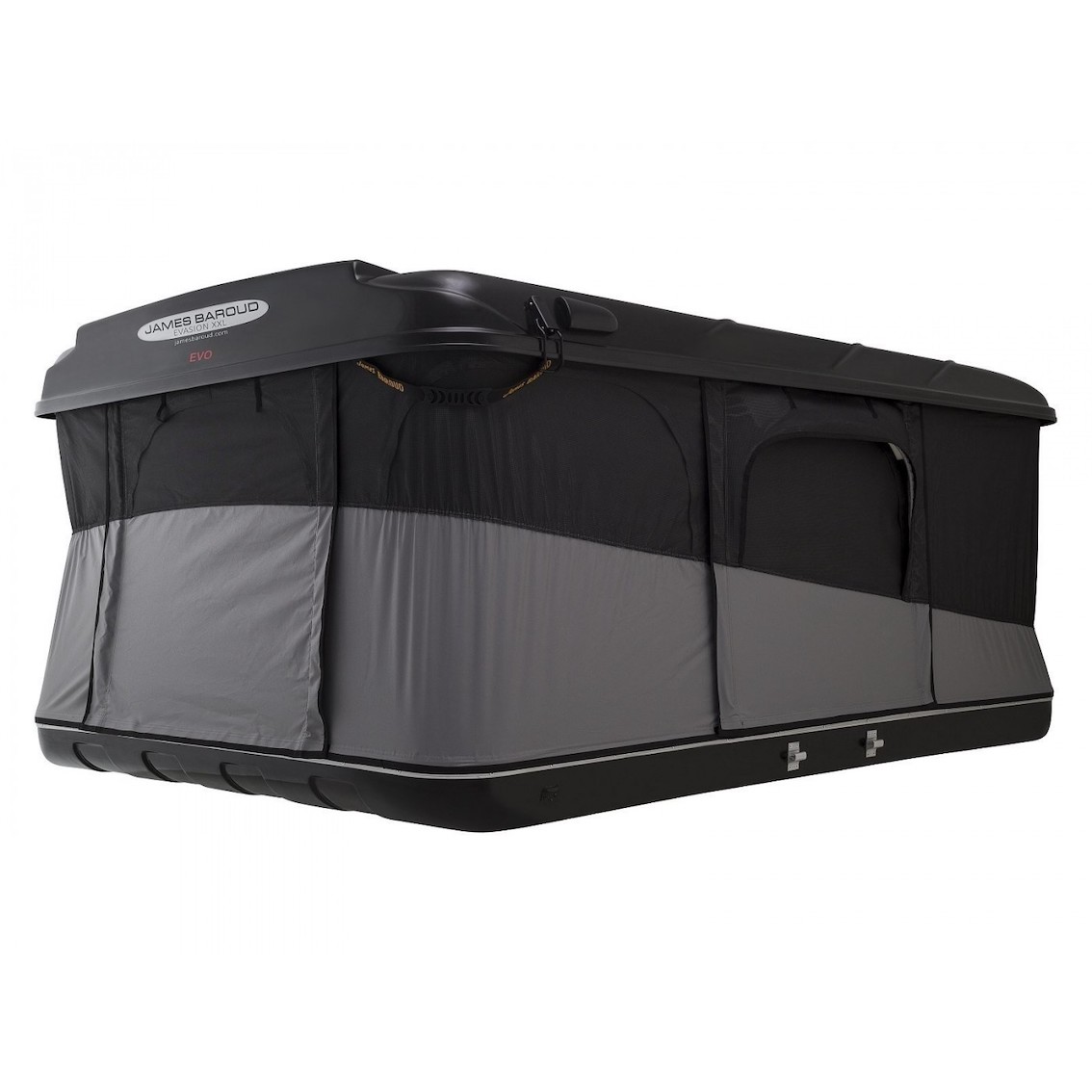 Alle Hartschalen-Dachzelte von James Baroud sind vollausgestattet und haben auf drei Seiten großzügige zweilagige Eingangstüren mit Fliegenschutzgittern. Die von beiden Seiten zu öffnende Reißverschlüsse ermöglichen ein flexibles Öffnen der Eingänge. Die geöffneten, aufgerollten Türen können mittels Klettband fixiert werden. Für eine angenehme Durchlüftung können die Türen z.B. nur oben etwas geöffnet werden. Speziell ausgeformte Hauben erlauben, je nach Zeltausführung, diese Öffnung auch bei Regen. Alle Türen sind an der Unterkante mit Klettband versehen und können damit komplett verschlossen werden. Somit kann weder Regen noch Getier eindringen und das Schließen der Dachschale wird vereinfacht weil nichts heraushängt. Das beidseitig öffnende Zelt das Evasion Evolution XXL hat zudem an der Vorderseite noch eine weitere verschließbare und regengeschützte Lüftungsöffnung, ebenfalls mit Moskitonetz.