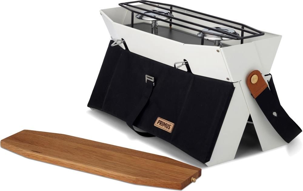 Der Onja ist ein sehr kompakter und moderner Kocher mit zwei Brennern. Dank des Umhängegurtes lässt er sich leicht transportieren und funktioniert auf einem Ausflug in der Stadt ebenso gut wie an einem Wochenende mit dem Kajak. Im ausgezogenen Zustand bildet das Gehäuse eine solide Kochstelle und schützt die Brenner vor Luftzug. Die Oberseite verfügt über eine Abdeckung aus Eichenholz, die sich zusätzlich als Schneidebrett oder Servierplatte verwenden lässt.