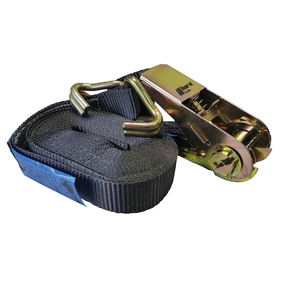 Der Spanngurt mit Ratsche und J-Haken dient zur Fixierung der Ladung für einen sicheren Transport.